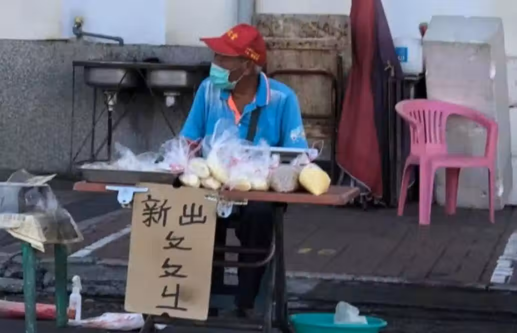 據《今日新聞》報導,畫面中,這位來自屏東的阿伯戴著口罩、皮膚黝黑,頭上戴著紅帽、穿著藍上衣,在路邊簡單地架起桌子賣東西,上面擺著一袋袋農產品,奇怪的是,告示牌卻寫著「新出ㄆㄆㄐㄧ」讓人滿頭問號,他到底賣的是什麼東西呀?