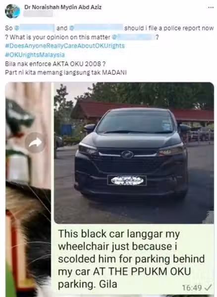 曾是希盟公正黨布城國席候選人的諾萊莎於昨日傍晚6時06分,在社媒「X」分享此惡劣事件,她也標記多名部長和國會議員,要求政府部門能重視殘疾人士的權益,並援引2008年殘疾人法令,對違法人士展開調查。
