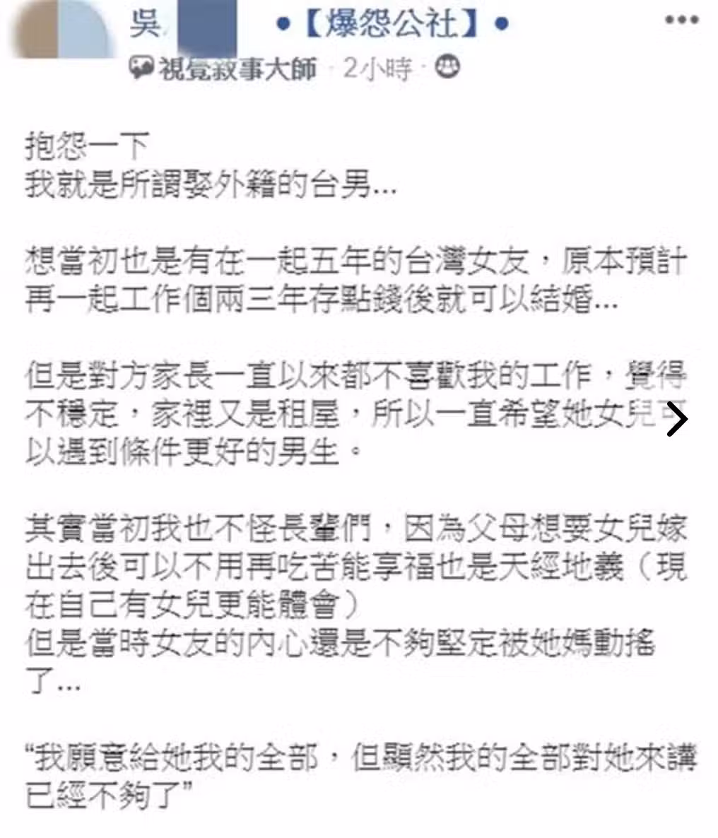 原本雙方已經論及婚嫁,但卻因為女友爸媽不喜歡他的工作,而分手了….