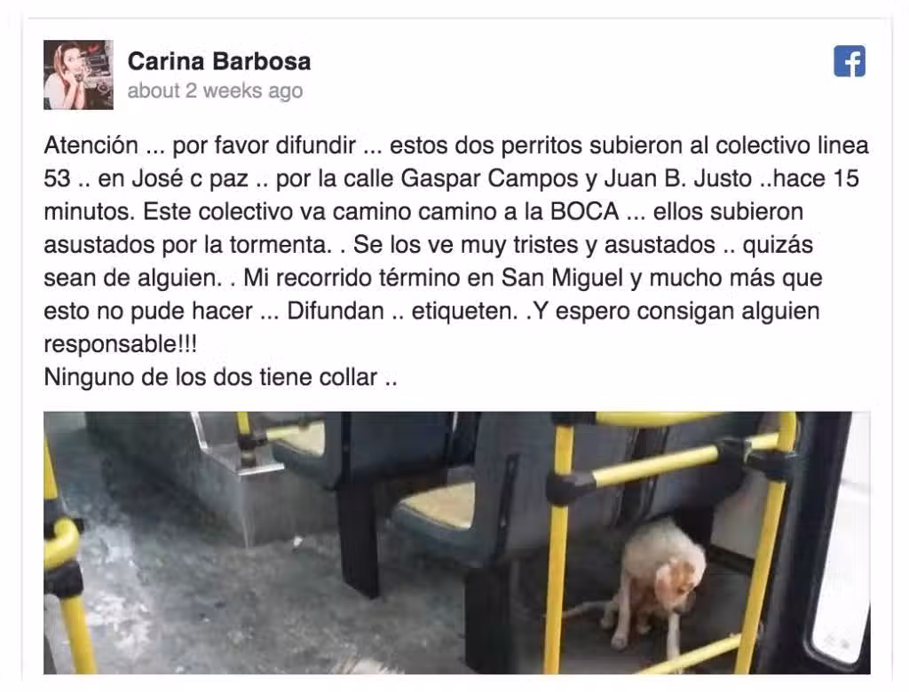 「有兩隻狗狗在53號公車上面,看起來難過又害怕,可能是誰家的狗狗,拜託大家幫忙分享,這兩隻狗狗都沒有項圈...」雖然後續消息無從得知,不過幸好司機的主管很贊成他的作法,所以不會有任何懲罰!