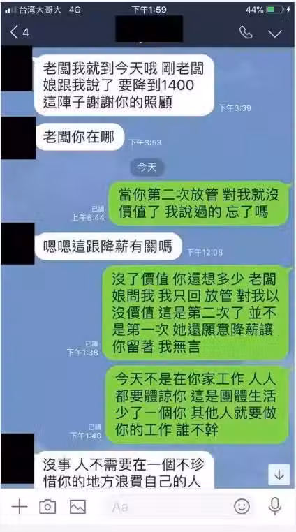 該員工在短訊中認為他的日薪由1700元降低到了1400元,不公平,簡直就是侮辱。他還質問老闆為什麼70歲老員工都能拿到1800元的日薪,自負表示「人不需要在一個不珍惜你的人地方,浪費自己的人生」。