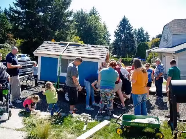附近的建材商知道海莉的舉動後,決定只收取她一半的建材費,並且還有23名鎮民決定幫助海莉一起建造流浪漢小木屋。圖中是眾人將木屋放到推車上。