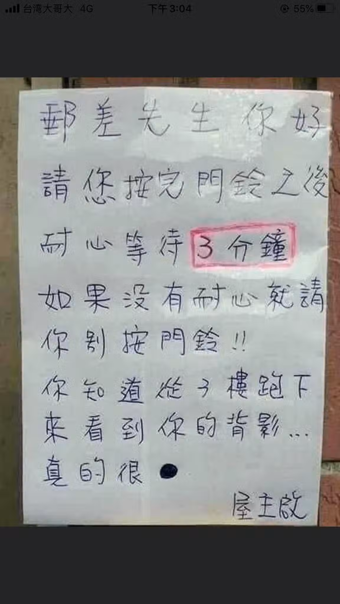 但也有人說,還是有很認真的郵差「我家這邊的郵差嗓門很大,還會喊好幾次等人下來拿」、「真感謝我家這裡的郵差,電鈴壞了還打電話問我要不要下來收,我說我人不在,郵差說,明天同個時間會在嗎?我說應該在,郵差說那我明天到了再打給你!」。