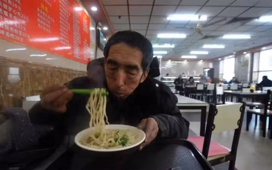 一碗素麵,沒有任何澆頭,只飄著幾片綠葉,這就是他的午飯。他還是吃得很香,這時候好不好吃不重要,重要的是一定要能吃飽,因為吃飽了下午才有力氣繼續幹活。一碗素麵的節儉生活,他已經堅持了三十多年,這就是一個普通的城市保潔員的生活。