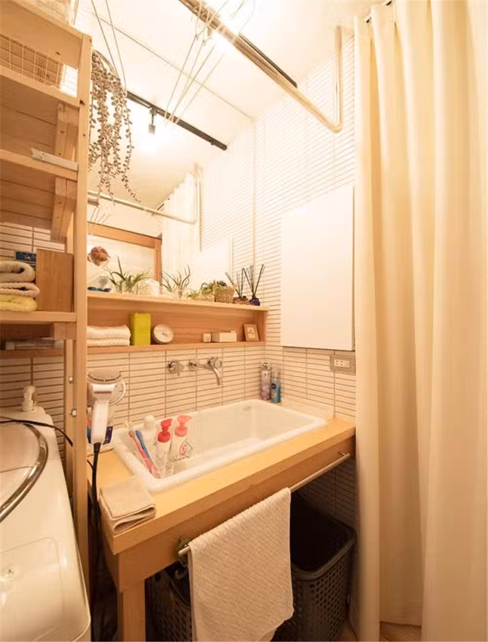 衛生間內,採用了日本很多家庭都會用到的「三分離」衛浴設計,就拿堀井夫婦的這間衛浴來說,洗漱區與洗衣區相結合,與浴室完全分隔而開,衛生間也在單獨的隔間內,讓空間使用更加靈活,互不打擾的同時,也不用擔心潮氣和衛生問題。