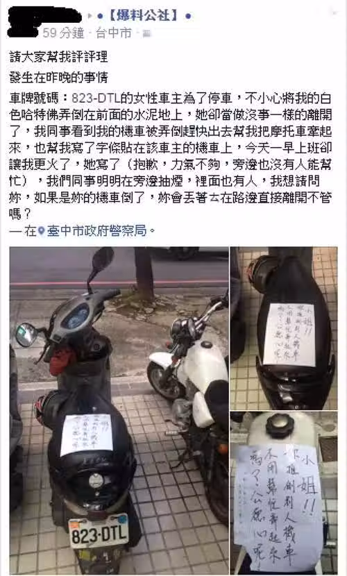 同事看不過去幫他寫字條給對方:「小姐!你推倒別人機車不用幫忙牽起來嗎?公德心呢?」