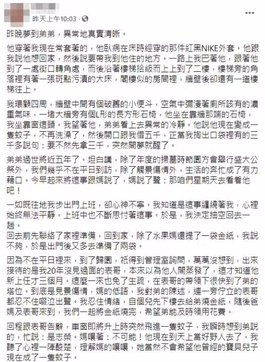 回程跟表哥告辭後,在車窗即將關上時突然飛進來一隻蚊子,原PO也忽然想起自己的夢境,並說那隻蚊子是弟弟,但媽媽卻直說不可能、弟弟已經去天上當有錢人了。原PO想了一想也理解媽媽,她當然不希望曾經的寶貝兒子變成一隻蚊子。
