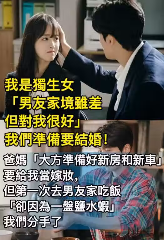 我是獨生女「男友家境雖然差但對我很好」我們正準備要結婚! 爸媽「大方準備好新房和新車」要給我當嫁妝,但第一次去男友家吃飯「卻因為一盤鹽水蝦」我們分手了