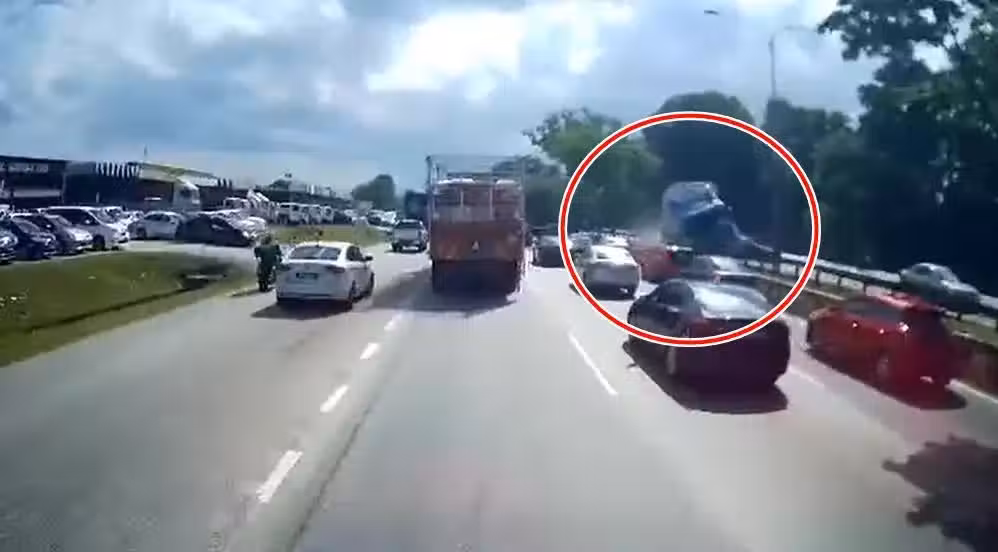 (新山25日訊)巴西古當大道發生嚴重連環撞車禍,一輛貨櫃羅厘疑被換道轎車撞上,失控沖向對面,連撞數輛轎車。