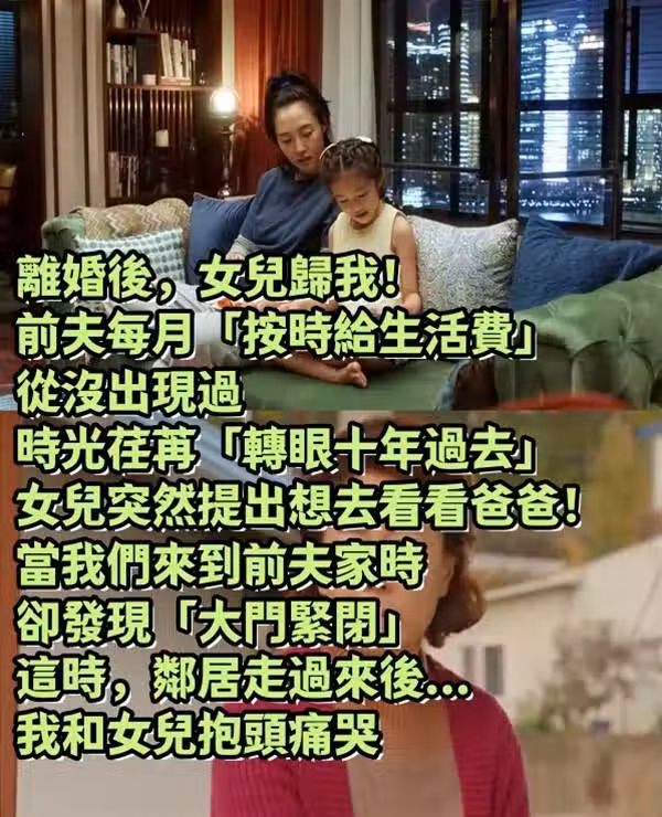 失婚後,女兒歸我!前夫每月「按時給生活費」從沒出現過 時光荏苒「轉眼十年過去」女兒突然提出想去看看爸爸!當我們來到前夫家時,卻發現「大門緊閉」這時,鄰居走過來後...我和女兒抱頭痛哭