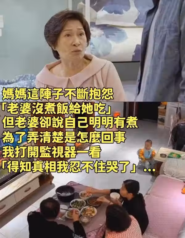 媽媽這陣子不斷抱怨「老婆沒煮飯給她吃」,但老婆卻說自己明明有煮,為了弄清楚是怎麼回事,我打開監視器一看「得知真相我忍不住哭了」...