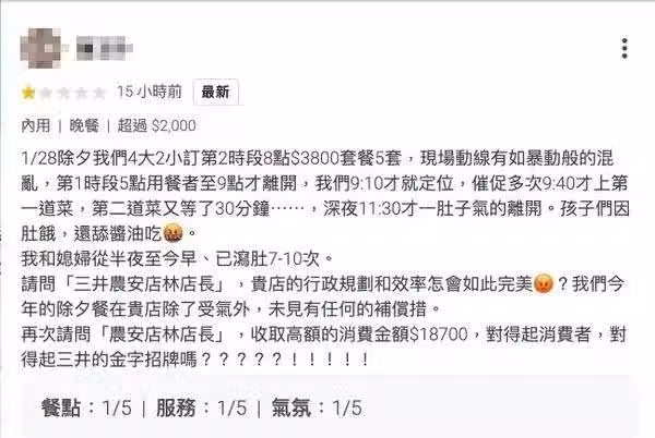 此外,點餐內容也被限制,結果團圓飯吃到半夜12點,最後的水果還是「切一半的櫻桃」,讓消費者大傻眼;有其他消費者留言「上來的A5和牛完全是冷的,在我們反應後一位主管人員過來致歉,最後在我們要結帳時,光結帳又等了快半小時」。