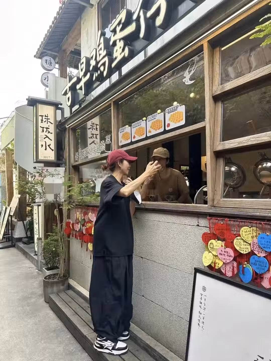 蔡少芬現身珠海,頂著烈日逛街,排隊買雞蛋仔,被老闆大讚性格好