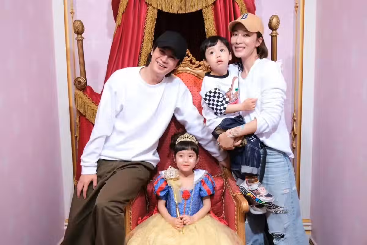 楊怡和羅仲謙戴著同款帽子,穿著同款白色t恤,情侶裝盡顯恩愛。3歲的弟弟Eden雖然沒有看鏡頭,但是看著別處發獃的模樣也是好可愛。一家四口幸福惹人羨。