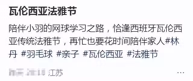 林丹在最新動態中分享出一家三口視頻,飛西班牙瓦倫西亞與謝杏芳和兒子團聚的他,目前已經回國。雖說不能像謝杏芳一樣留在西班牙陪兒子上學,但他表態稱再忙也要花時間陪伴家人。