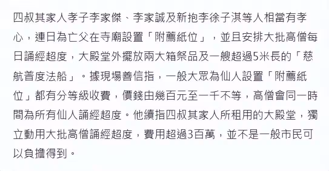 港媒曝李兆基兒子花300萬辦超度法會,請200高僧誦經,現場照曝光
