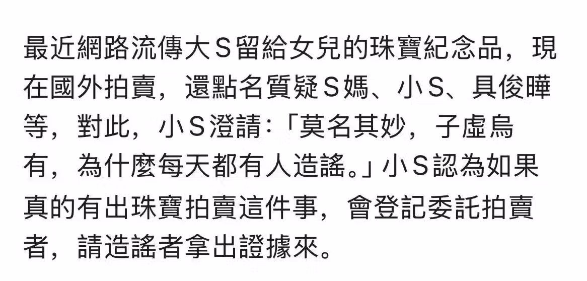 小S表示,如果真的有拍賣珠寶這件事,主辦方會登記委託拍賣者,那就請造謠的人拿出證據。