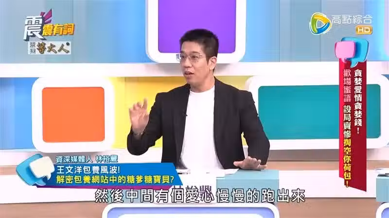 林裕豐表示,上頭的女孩子們都會放生活照,並把所有資訊寫得清清楚楚,包含每個月多少錢「我覺得對於這些大老闆來講的話,是一個好處」「你不用去猜、不用去認識、不用去跟她曖昧」,只不過他指出,王文洋這次認識的自稱是大學生,「可是你要注意,每個都是大學生,但是你看她的樣子,也不像大學生,除非她是延畢很多年」。