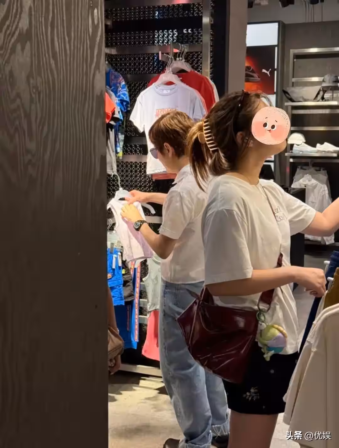 在一家服裝店中,她手持一件時下流行的白色緊身短款背心,仔細端詳著,眼神專注,恰似尋常女孩挑選衣物般,毫無明星的架子。