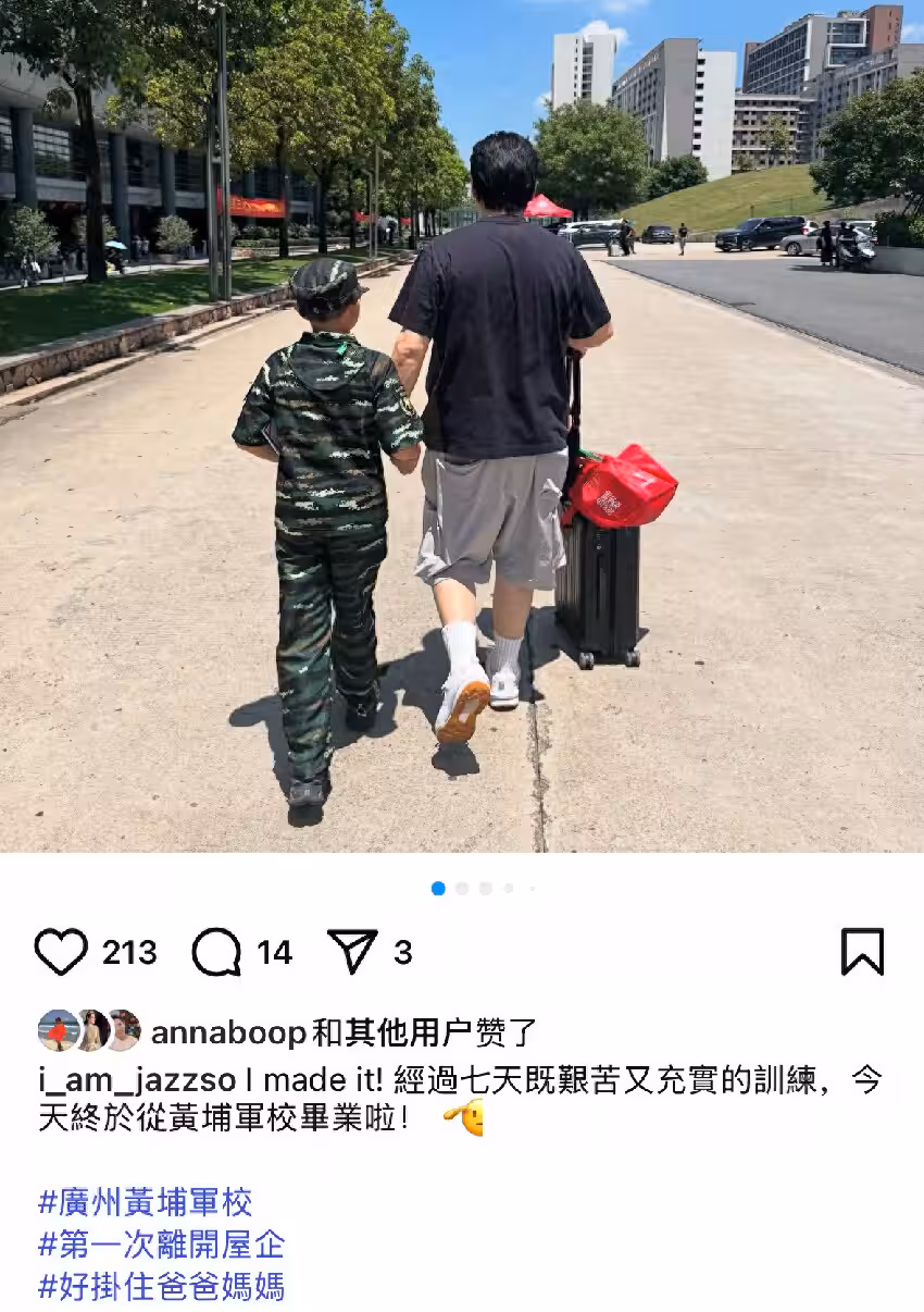 所以一家三口在軍訓營的坦克模型車前留影,只見Jazz拿著結業證書,穿著一身迷彩服,戴著軍帽,經過七天的軍訓後,皮膚被曬得又黑又紅。