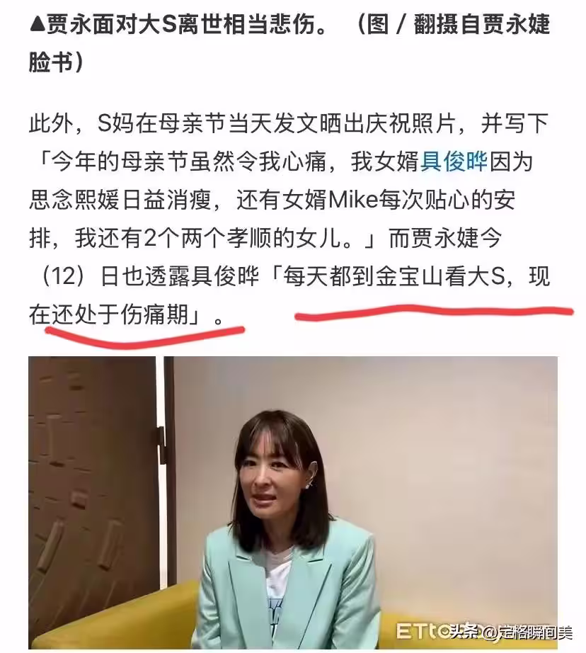 其中有灣內媒體採訪到,大S媽媽黃春梅女士,問她有沒有關注到媒體報道的消息?她回覆說:「有關心他,感恩,他太愛熙媛了,真愛傷心又傷身」。