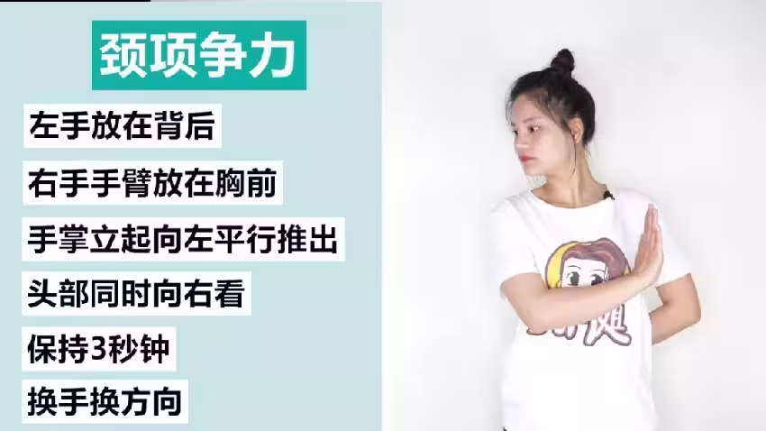 雙手交叉,置於頭頸後側,頭頸用力向後,和手相抵抗以上幾個動作,大家每天堅持練就可以舒緩僵硬的頸部肌肉啦