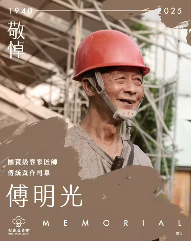 如今,客委會與文化局均表示,傅明光司阜不僅是「客家傳統建築的活教科書」,更是傳統匠師的典範,他畢生精神與技藝將長存於屋脊與瓦間,一生對客家傳統建築工藝與文化資產保存貢獻良多,離世是地方乃至全國文化領域的重大損失。