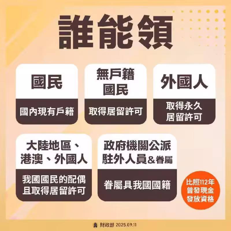 部公告,以下對象每人每領 1 萬元:「現有戶籍國民」、「取得永久居留許可的無戶籍國民」、「取得永久居留許可的外國人」、「大陸地區、港澳、外國人為我國國民的配偶並取得永久居留許可」、「政府機關因公派駐外人員及其本國國籍所屬」。