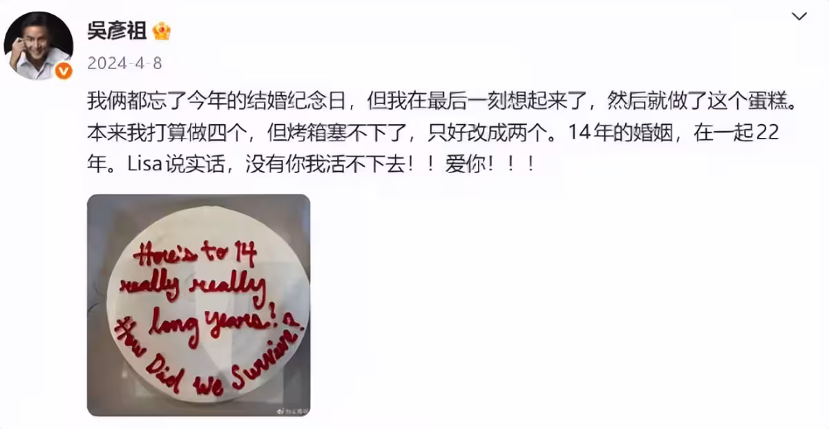 去年結婚14周年,吳彥祖發了張烤糊的蛋糕照片,配文「本來想做四個,烤箱塞不下,只好烤兩」,後面加了句「Lisa說實話,沒有你我活不下去」,把多少人看哭了。