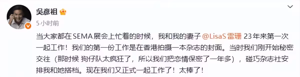 11月6號下午兩點,吳彥祖突然在微博曬出和老婆Lisa的合照,評論區直接炸鍋。--------------------------------------------------