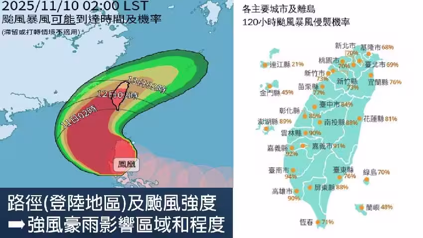 最新120小時颱風暴風圈侵襲機率出爐,台南市以94%居冠,嘉義縣92%、嘉義市91%緊追在後,雲林縣與高雄市同為90%,共計5縣市達9成以上。