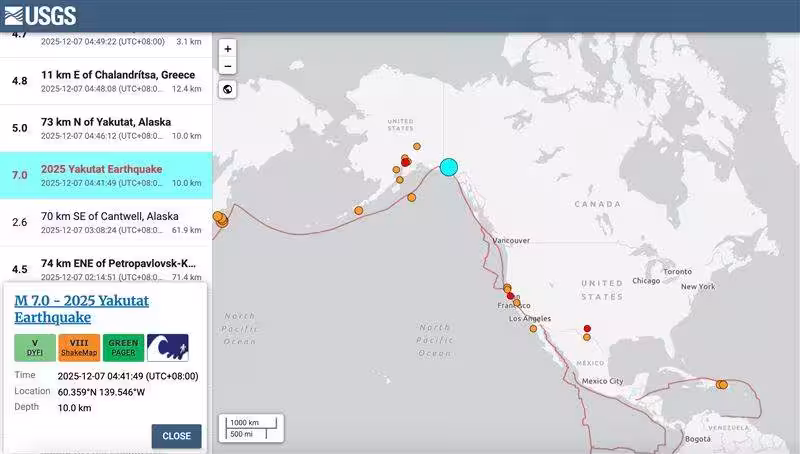 根據《三立新聞網》報導,位於美國阿拉斯加州及加拿大育空地區交界的偏遠區域,在當地時間今日突然發生芮氏規模7.0的強烈地震。地震深度僅10公里,屬於淺層地震類型,震後陸續出現數次規模較小的餘震活動!