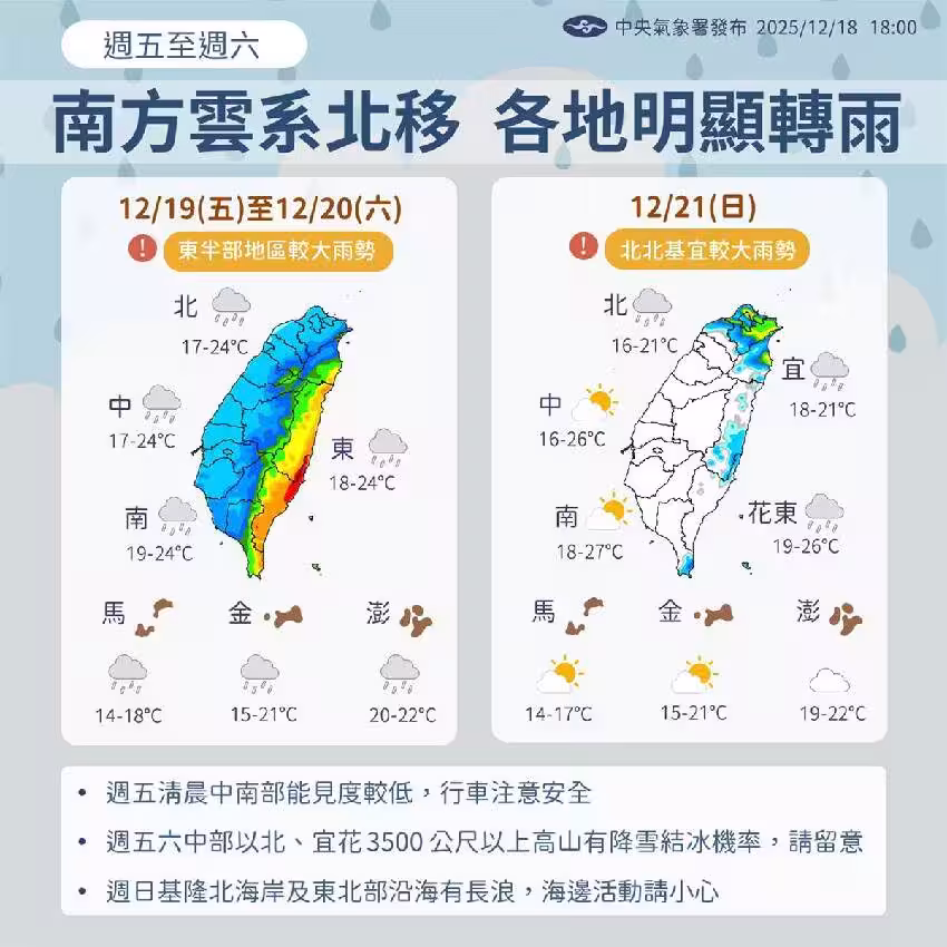 氣象專家吳德榮在專欄撰文提醒,周日冬至當天東北季風等級冷空氣報到,迎風面的北部、東半部轉為有局部短暫雨,北台灣天氣轉涼;周一季風逐漸轉干,北台降雨後轉多雲、氣溫仍偏涼,東半部則維持局部短暫雨機率;周日、周一中南部受影響程度輕微,維持晴朗穩定型態。