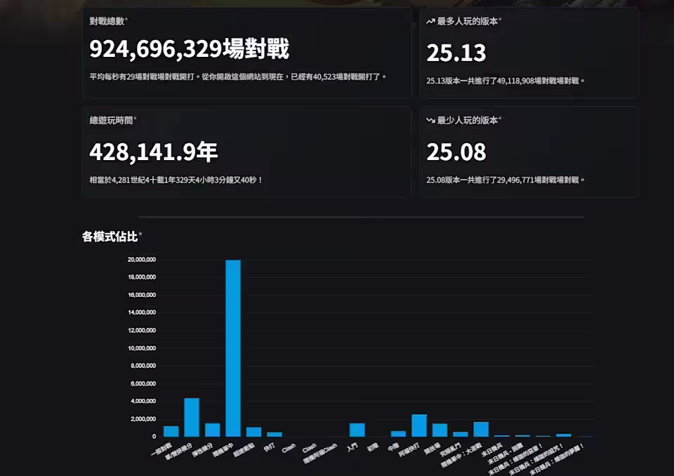 不過,《英雄聯盟》台服的數據卻獨步全球,過去一年內台服玩家一共打了 19,981,1520 場隨機單中對戰,而作為對比,單/雙排積分對戰在台服只打了 4,360,945 場。此外,過去一年間全球《英雄聯盟》玩家們一共打出了超過 68.8 億次擊殺,其中包括了超過 1.69 億次的五連殺。總死亡數達 68,634,843,184 次,是第二次世界大戰的 874 倍,死亡時間加總超過 7.68 萬年。而相比之下,《英雄聯盟》玩家們也樂於助人,全球助攻數突破 117 億次,「正在趕路」準備支援隊友的信號也發送了超過 350 億次,是大家最愛用的信號燈。