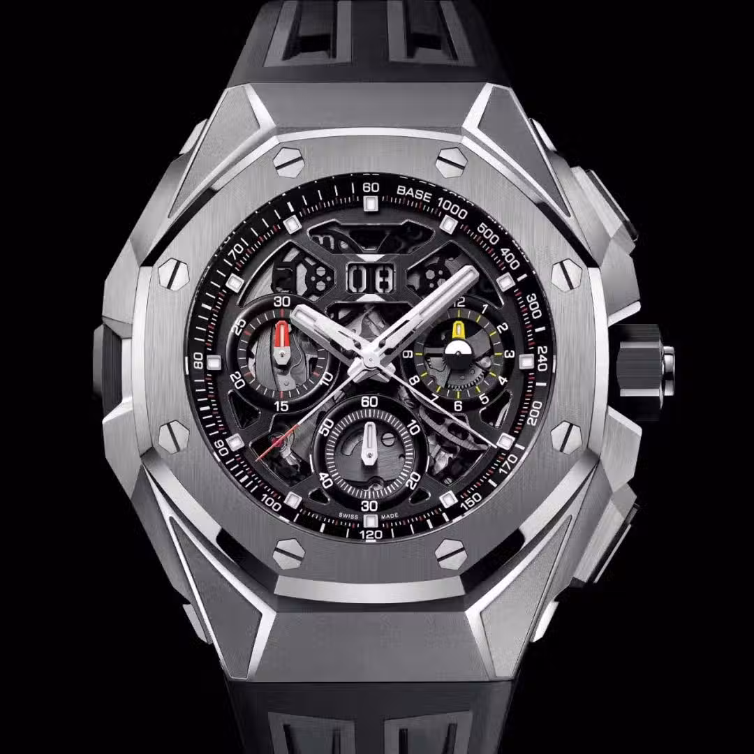 值得注意的是,腕錶採用鈦合金表殼,43毫米的直徑保持了皇橡概念系列的一貫表現,而17.4毫米的厚度在同系列裡依舊算是最敦厚的那一檔。或許從這裡可以看到愛彼對這個系列的定位,哪怕機芯已經纖薄,但表殼依然要十足強健,走的就是極致硬朗風。