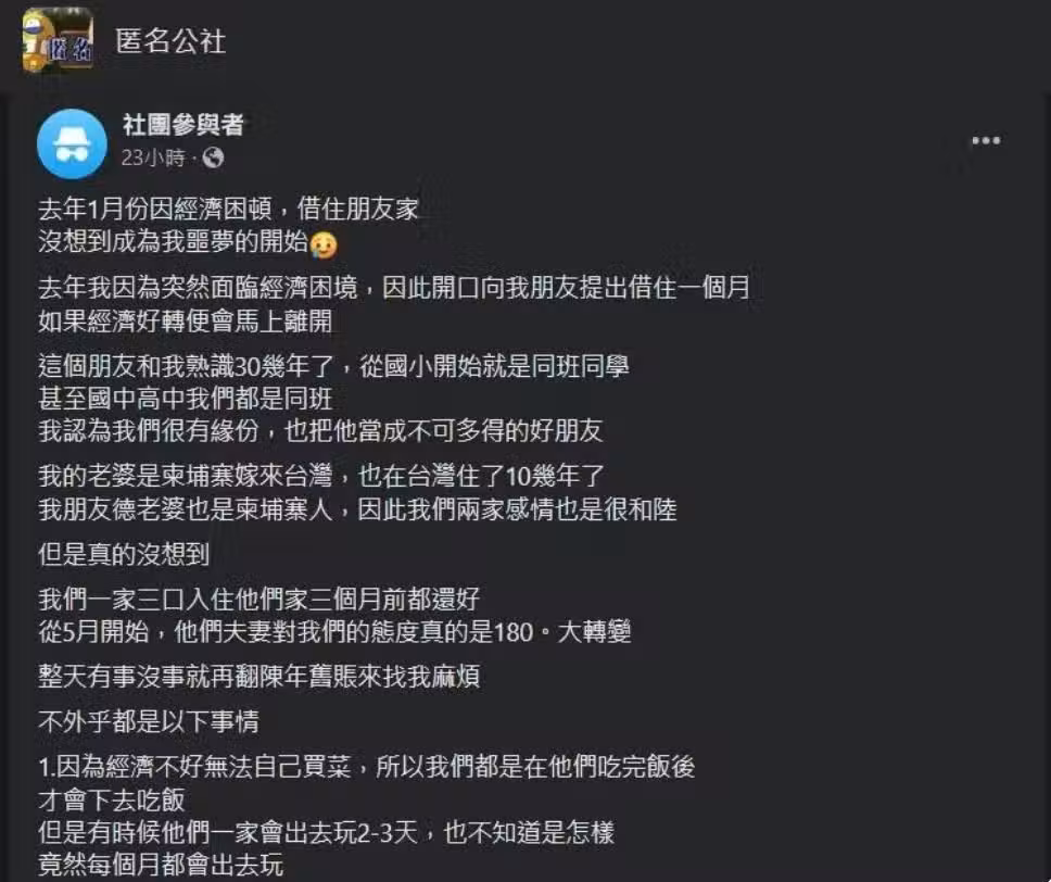 最後他跟朋友借了12萬做生意,想等生意穩定一點再搬走,沒想到友人已經受不了想要他們搬走,更說這段期間都沒跟他們收房租水電,他聽了反倒說:「呃…我就是因為沒錢才來住你家的啊!是要我怎麼出錢?」文末還勸大家:「反正勸各位真的不要寄人籬下,不然你們也會看清什麼才是所謂的『好朋友』」