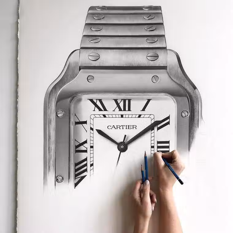 ▲卡地亞的Santos de Cartier是藝術家很愛的一隻錶,她欣賞卡地亞的簡潔典雅設計。Source:Facebook @juliekraulisart