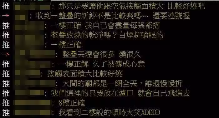也有網友在《Dcard》發文,小時候燒金紙整疊丟下去都被阿嬤狠 罵一頓,直到有一次鼓起勇氣問媽媽:「為什麼不可以一次燒完,又熱又浪 費時間,捆著也比較好數錢啊!」