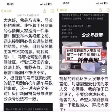 馬若松的父親使用兒子的抖音帳號發文,悲痛表示目前尚未收到交通隊調查結果,然而看到網絡上傳言說是飆車造成事故,還有許多人寫下攻擊留言,令他難以接受:「對剛剛遭受創傷的家人又一次網暴,我的孩子已經沒了,不要給他潑髒水。逝者為大,希望大家能夠尊重一下逝世的人!拜託大家了!」