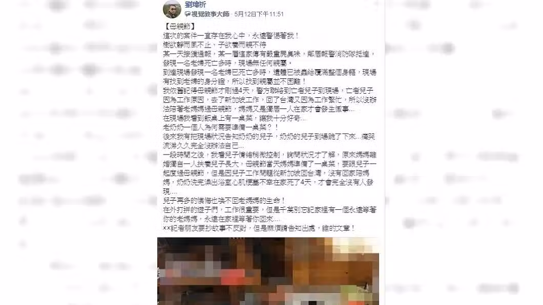 聽到殯葬業者劉瑋祈講述現場的情況,老婦兒子跪下來痛哭,卻喚不回母親的生命,其實,父母並不求孩子們要多富貴,只希望在外打拚的兒女能回家陪陪自己... 工作再重要,也不及於那個在家裡默默等你的媽媽!別讓彼此都留下遺憾,在還能說愛的時候,向最重要的家人、愛人,說出心中最深的愛吧!