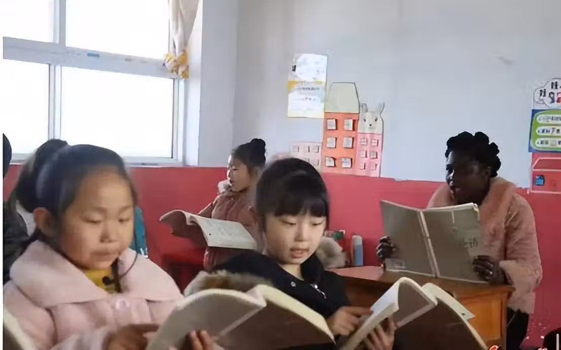 在一群幼兒中間,坐在特製的桌椅上,黑人女子顯得非常突兀,可是她渾然不覺,認認真真地跟著老師念起了《論語》。