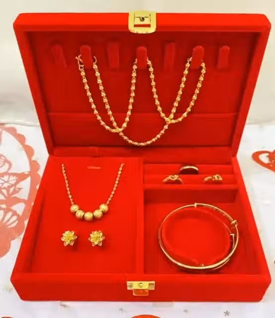 這套首飾是我給你堂弟媳婦買三金的時候相中的,我覺得很適合你戴,就給你買下來了。不許退回來,也不許客氣。我們就生了你堂弟一個臭小子,老了還指望你這個小棉襖照顧呢。