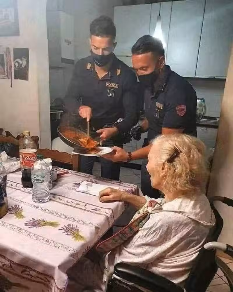 近年在推特上,有位網友PO出了一張照片溫暖了很多人,這張照片裡頭是兩位來自義大利佛羅倫斯的員警、和一位坐在輪椅上的奶奶,而拍照當下的情境是那位87歲的獨居奶奶,因為肚子餓而打電話報警,因此兩位在當地值勤的警察立刻到達奶奶的家裡...