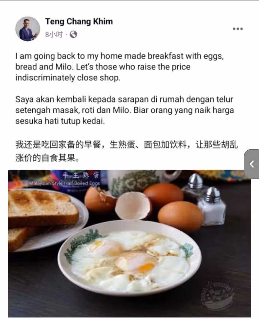 一些網民則趁機反映,指鄧章欽今日所面對的問題,是百姓日常面對的情況,甚至部分地區的早餐收費已高達人均12令吉至15令吉。
