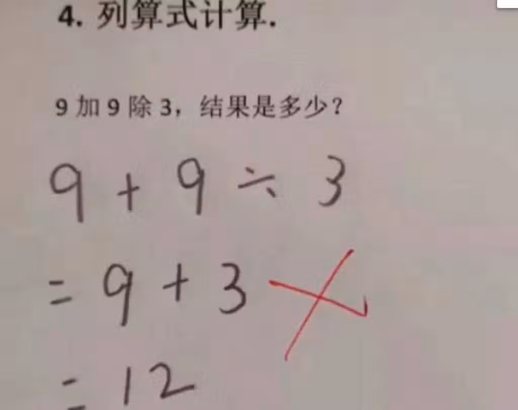 我兒子哪錯了?國小三年級數學題:「9+9÷3= 12」被老師打叉!家長質問老師「反被打臉」:好好審題