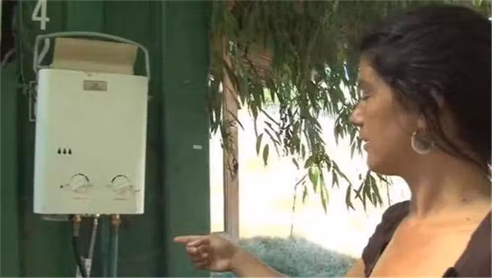 看似貧乏又窄小的空間,卻功能齊全,貨櫃的外部還布置了一個熱水器設施,冬天洗熱水澡,完全沒有問題。