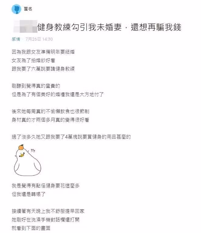 然而,女友過沒多久又開口要4萬塊錢,說是要買健身用品;儘管他覺得不太對勁,仍乖乖轉賬,「直到有天晚上我不舒服提早回家,她剛好在洗澡,而手機對話欄是打開的,我就看到下面的畫面。」