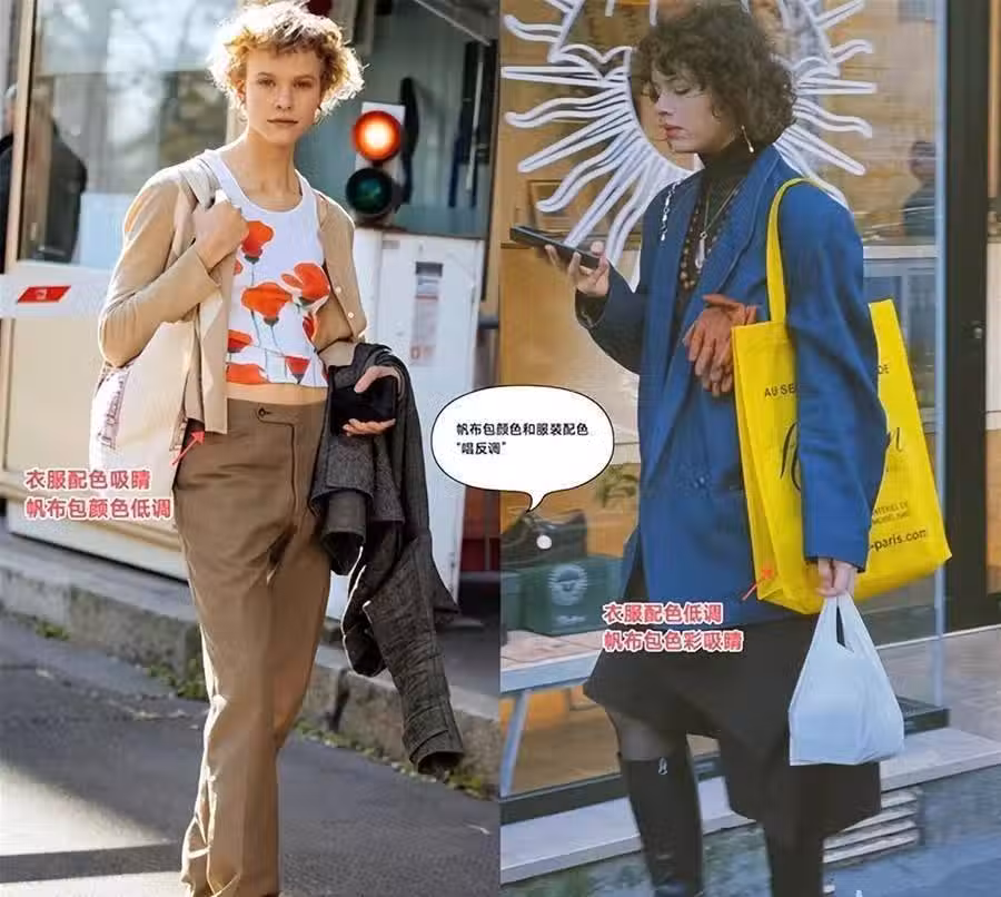 衣服配色吸睛或有夸張花紋時,帆布包便會選擇低調的基礎色或純色;而當衣服多為純色、低調色時,帆布包則會變得吸睛,高亮度、高飽和彩色,個性花紋等都能讓搭配從人群中脫穎而出~