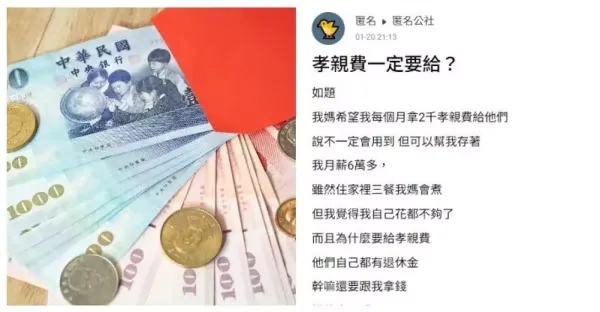 我月入6萬!吃住靠家裡「被媽討2千孝親費」我自己花都不夠 他們都有退休金本來就有撫養義務,反正我覺得不需要…