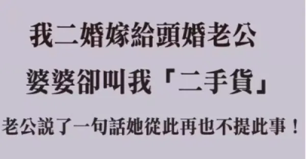 我再婚過嫁給第一次結婚的老公,婆婆竟嗆我是「二手貨」,老公說了一句話,她從此再也不提這件事!